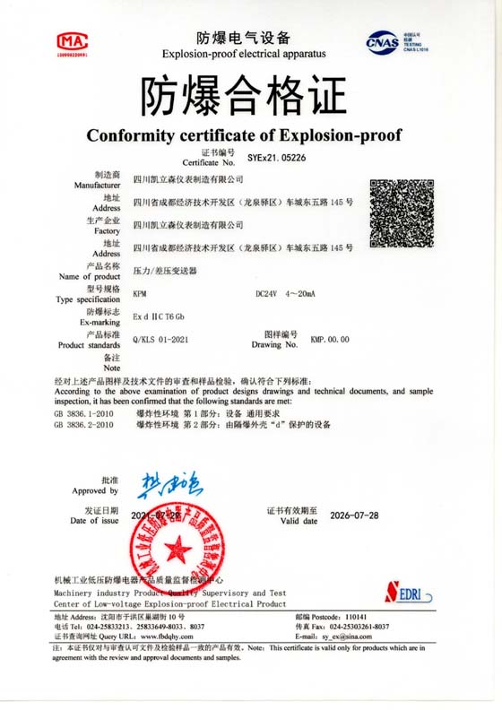 壓力/差壓變送器防爆認證